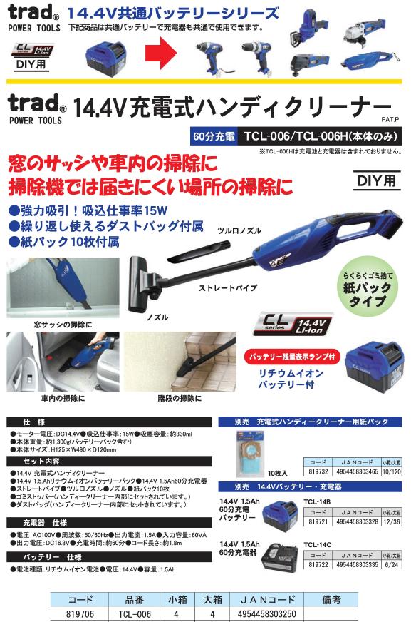 ●繰り返し使えるダストバッグ付属●trad TCLシリーズ共通14.4Vバッテリーパック使用。
