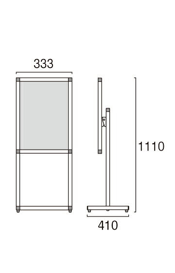 ●パネルフレーム=アルミ押し出し材/アルマイト仕上げ (シルバー) ●本体ポール部=アルミ押し出し材/アルマイト仕上げ (シルバー) ●脚部=縦パイプ/アルミ押し出し材/アルマイト仕上げ(シルバー) 横パイプ=ステンレスパイプ #400 ●コーナー=樹脂 ●面板=アルミ複合板(白)3mm厚 ●表面カバー=アクリル(透明)1.5mm厚 ●面板有効サイズ=W281mm×H404mm ●対応メディアサイズ=A3(W297mm×H420mm) ※受注生産品となります。